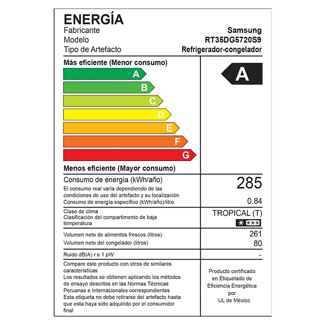 | Consumo energético | 285 kWh/year |